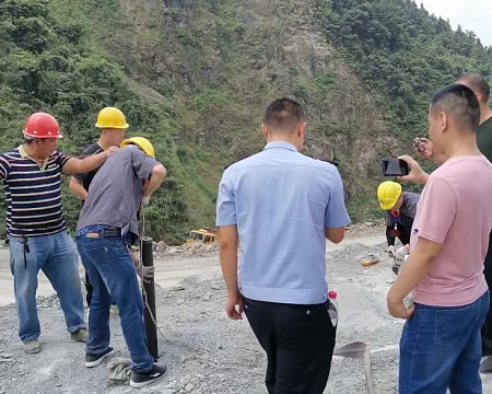 重慶創(chuàng)普達(dá)機械科技有限公司對施工現(xiàn)場進(jìn)行了勘察,制定了詳細(xì)的施工方案:一天半鉆孔25個,裝管25支,現(xiàn)場臨空面高約7米,采用3.5X3.5X4米一字排形鉆鉆孔,嚴(yán)格控制鉆孔尺寸和一字排形對應(yīng)尺寸鉆孔,最終結(jié)果測量為(裂鏠尺寸)是35米X6米X5.5米共1155方,每支管出方46.2方.